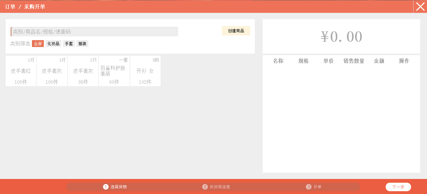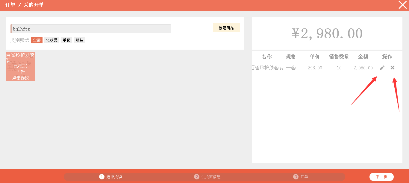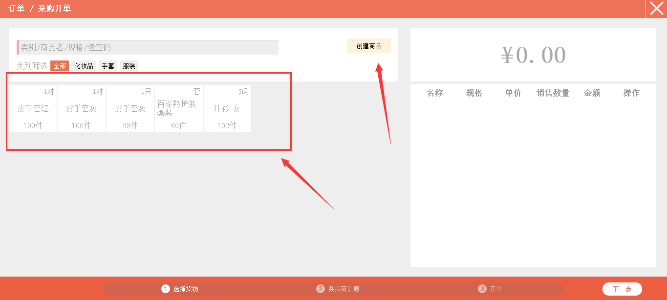 5、点击选择需要进行采购的商品,在右侧 触摸键盘或者系统自带键盘输入采购数量,点击