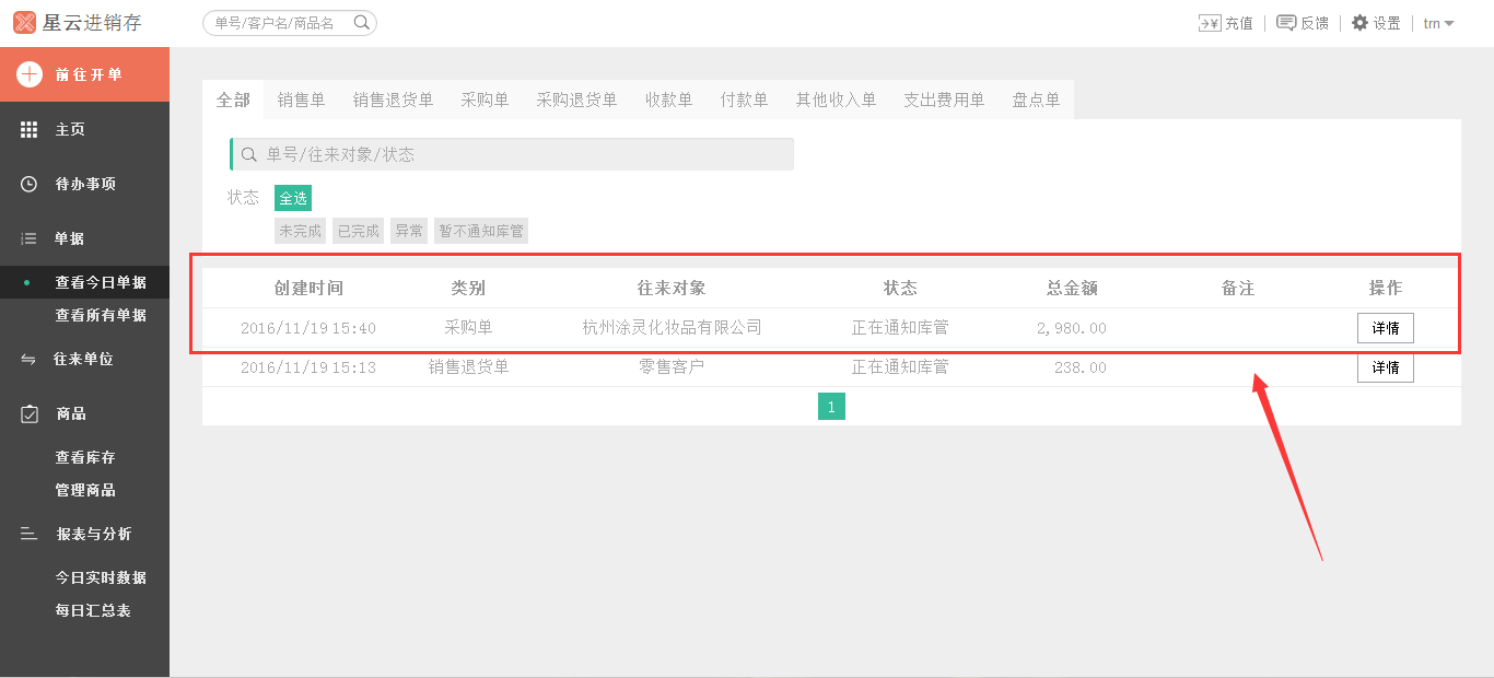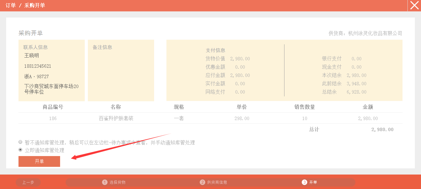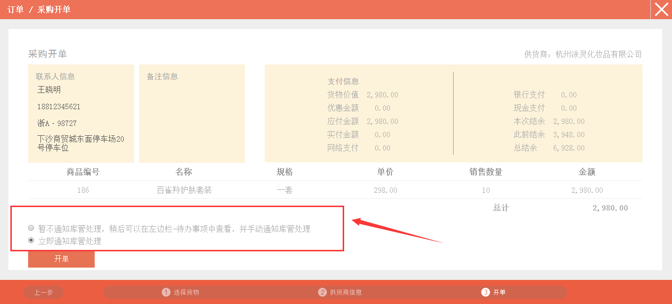 15、销售开单中包含了联系人信息、备注信息、支付信息以及商品信息,您可根据自身需要是否立即通知库管进行处理。注:暂不通知库管处理,意思是开完这笔单子后,系统不会提示库管处理,库管不能查看该笔订单;立即通知库管处理,意思是开完这笔单子后,系统会立即提示库管处理。