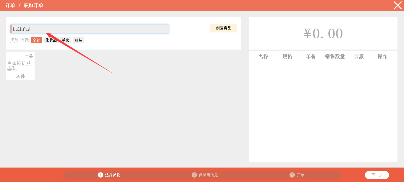 4、如果商品过多,可用速查码、类别、商品名和规格进行查找~在红色箭头所指的搜索框内输入速查码(商品速查码、往来单位速查码都可进行搜索查询),就会弹出对应的商品了哦~~~比如输入“bqlhftz”,就会跳出商品名为“百雀羚护肤套装”的商品。