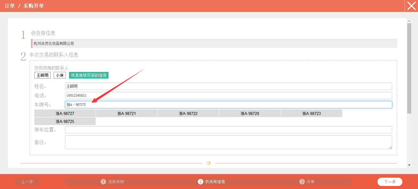 10、选择好目标客户后,会跳出该客户的联系人,点击选择目标联系人,会自动跳出该联系人的姓名、电话、车牌号。