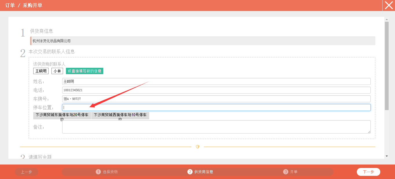 12、点击红色箭头所指的位置,选择目标停车位置。可根据实际情况填写“备注”,可填可不填。