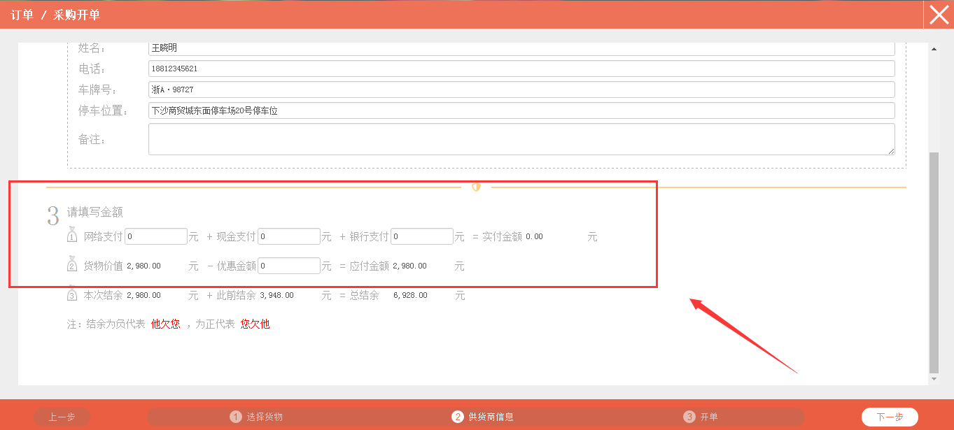 13、若通过网络、现金或者银行收到了对方的账款,在红色框内填写相应的金额。若是给了对方优惠,在优惠金额框内填写优惠金额。