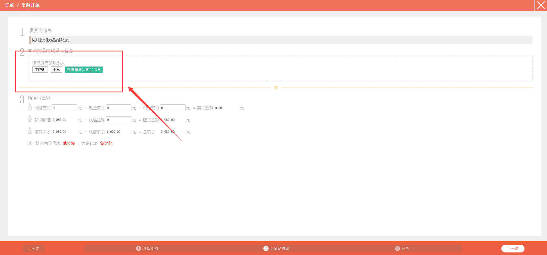 9、点击红色箭头所指的位置,会跳出您添加过的往来单位。注:若是没有您的目标往来单位,可点击