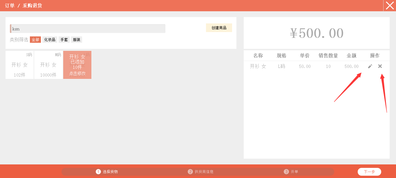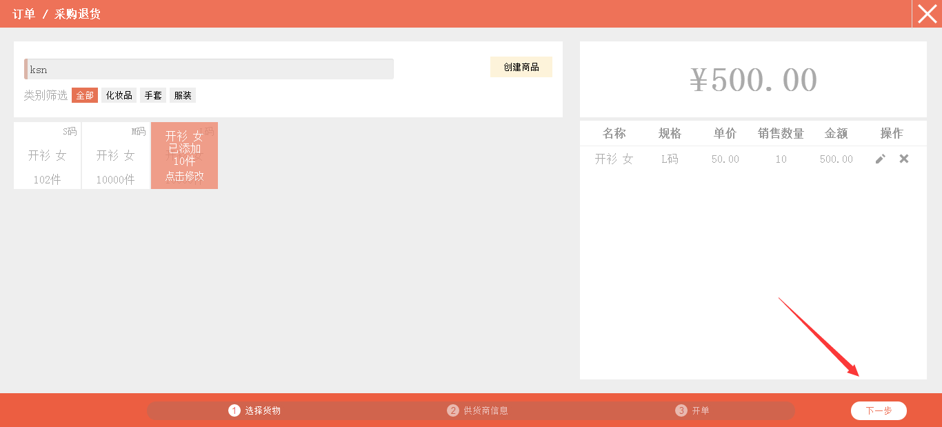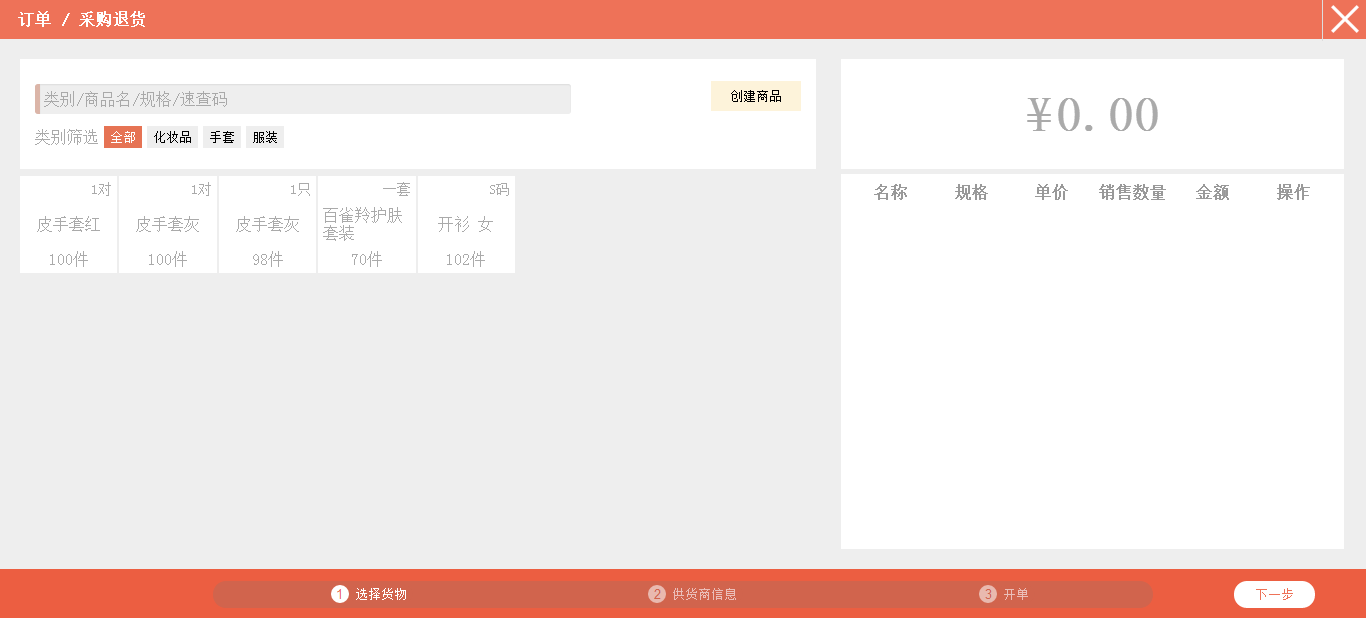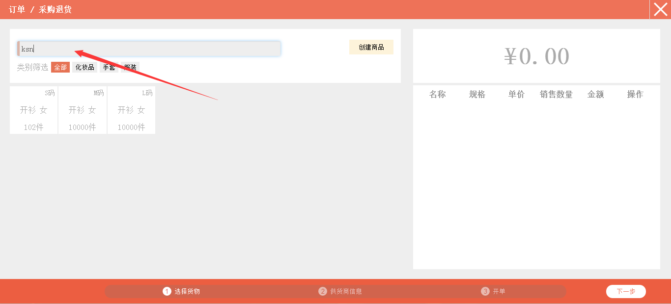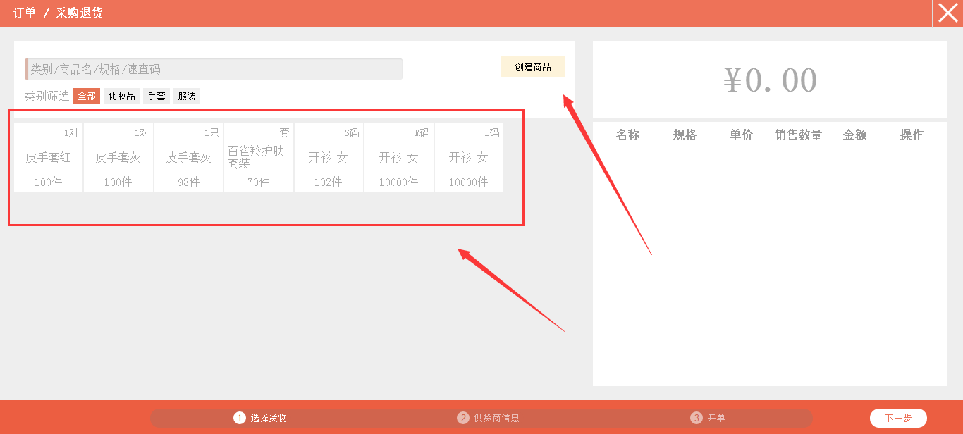 3、选择采购退货开单商品。(注:如果这里没有目标商品,可点击