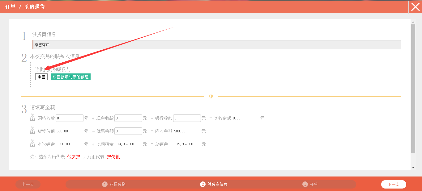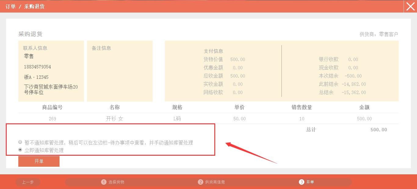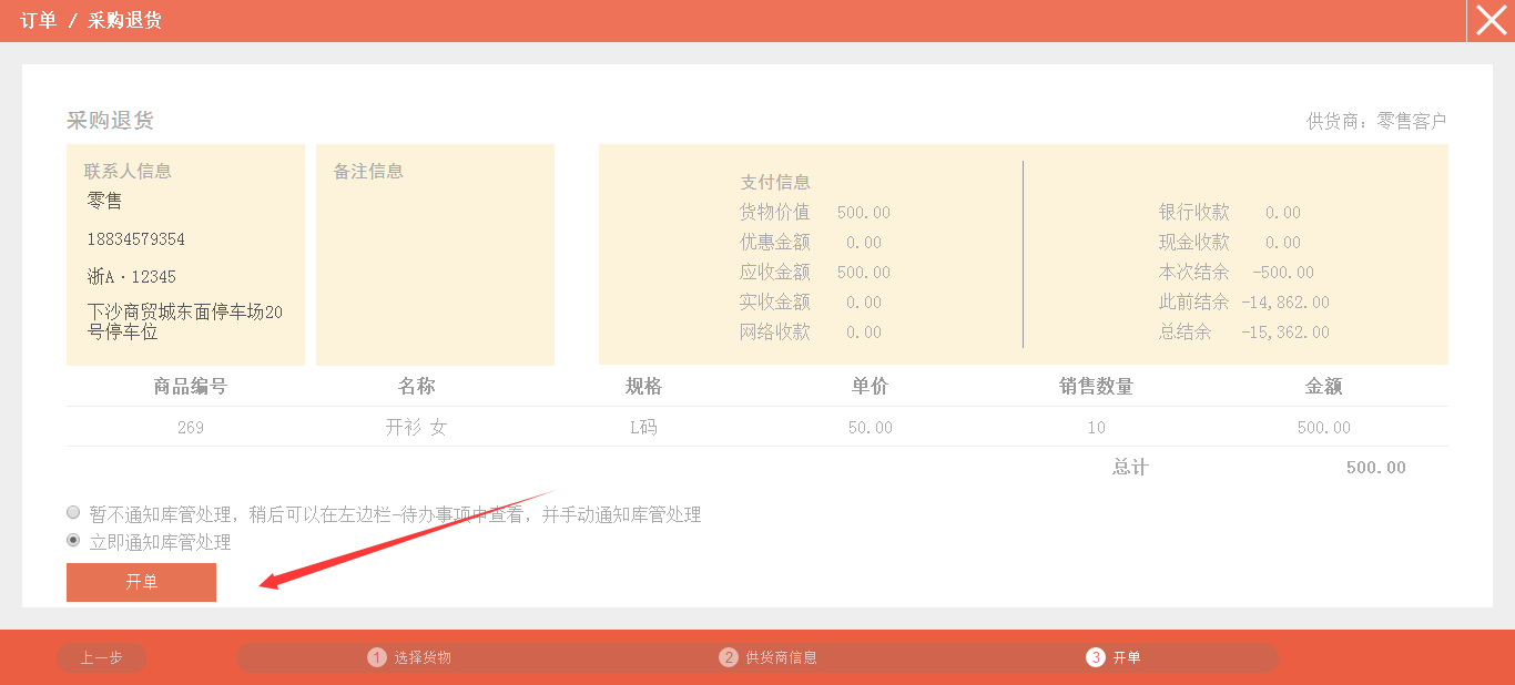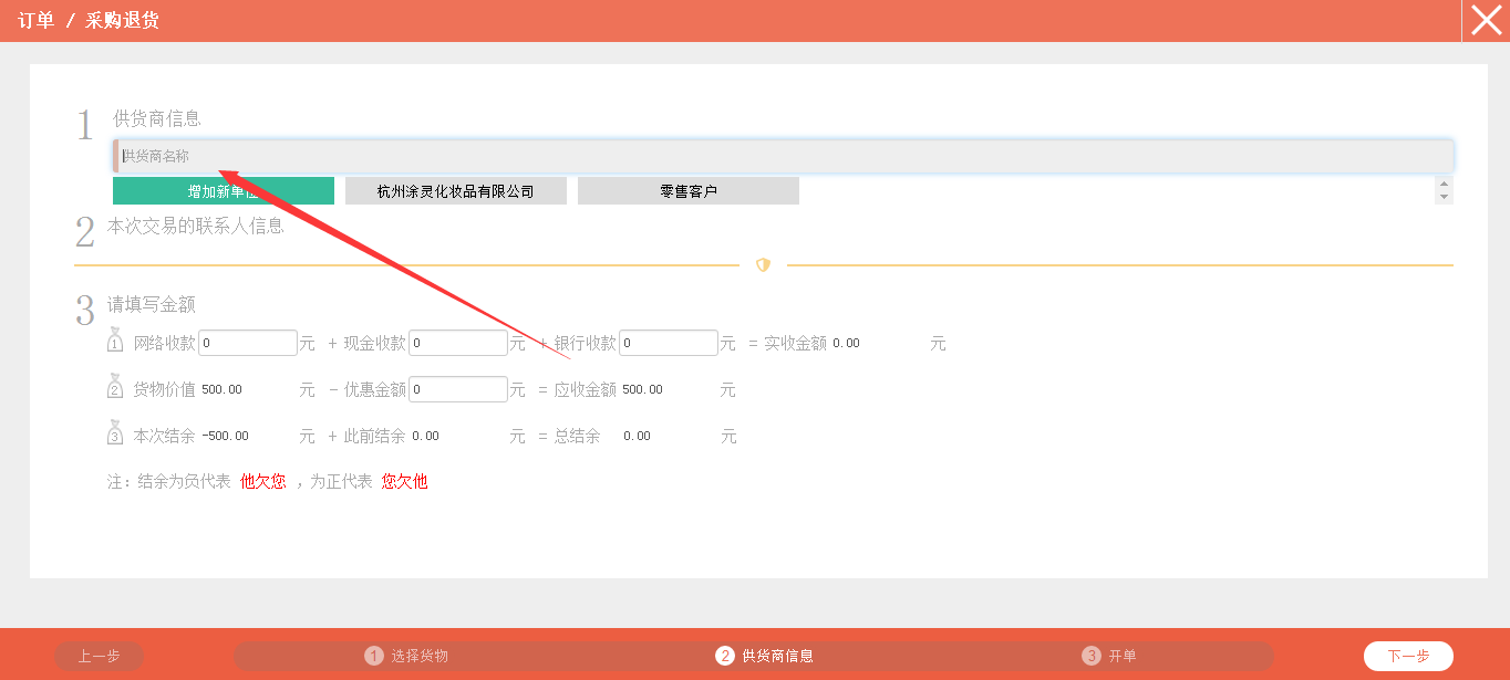 温馨提示:这里的采购退货开单不关联其他单据,比如您购买了商家的货物,不满意或者因为其他原因,想要退货了,您直接在这里开一个采购退货单即可,采购退货单是独立存在的,不需要您在系统里给该客户开过采购单。
