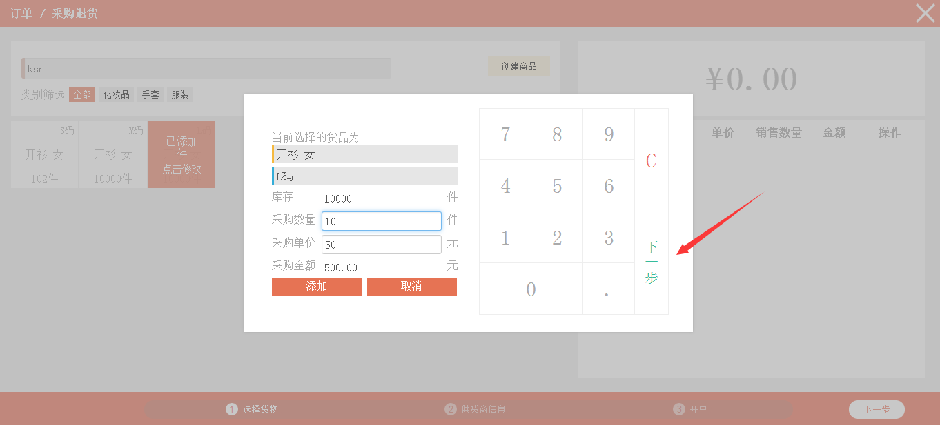 5、点击选择需要开单的商品,弹出的界面包含了您当前选择货品的信息,在右侧 触摸键盘或者系统自带键盘输入退货数量后,点击