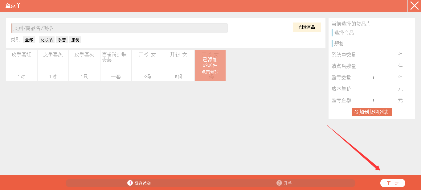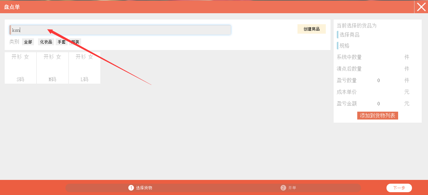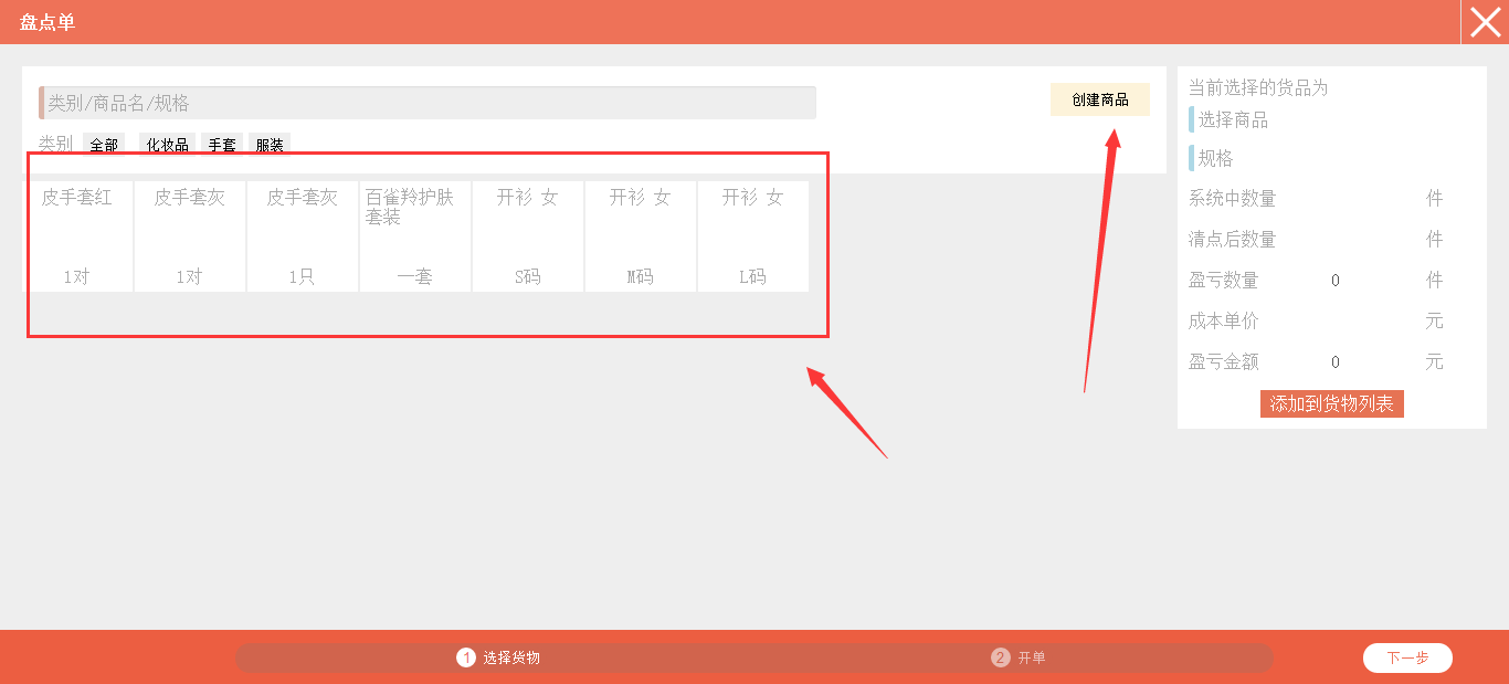 3、选择盘点开单商品。(注:如果这里没有目标商品,可点击