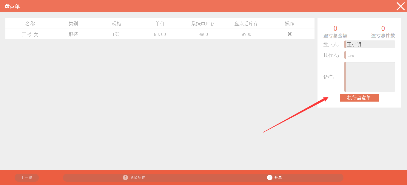 9、选择盘点人、添加备注(备注可添加也可不添加)。注:执行人,是指开这个盘点单的人;盘点人,是指负责盘点商品库存的人。