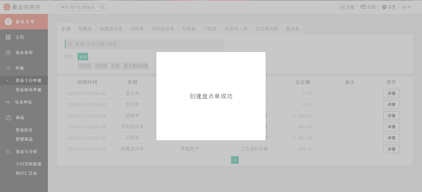 温馨提示:进入盘点单开单后,会对数据库数据进行锁定,同一时刻就不能新建其他单据了。退出盘点开单或者盘点开单完成后,才会解锁数据库数据。这是为了保证数据不出错哦~
