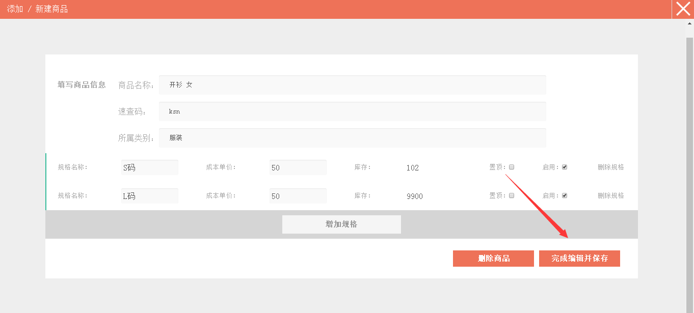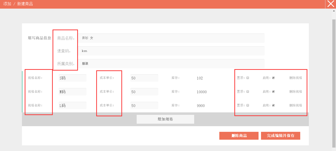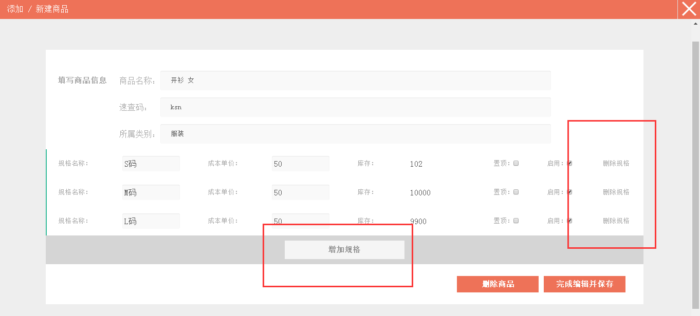5、可增删商品规格。注:如果商品已经有过往来交易,那么就不能删除商品规格。
