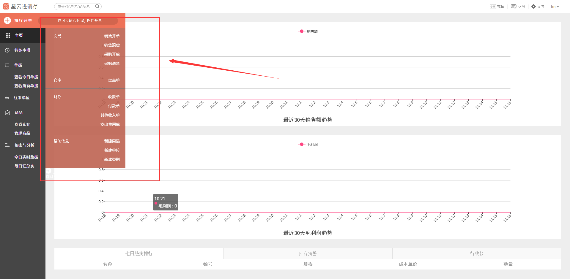 4、页面右侧的红色方块内的前往开单,主要是新建各种单据以及新建各种商品、类别、单位,具体如下: