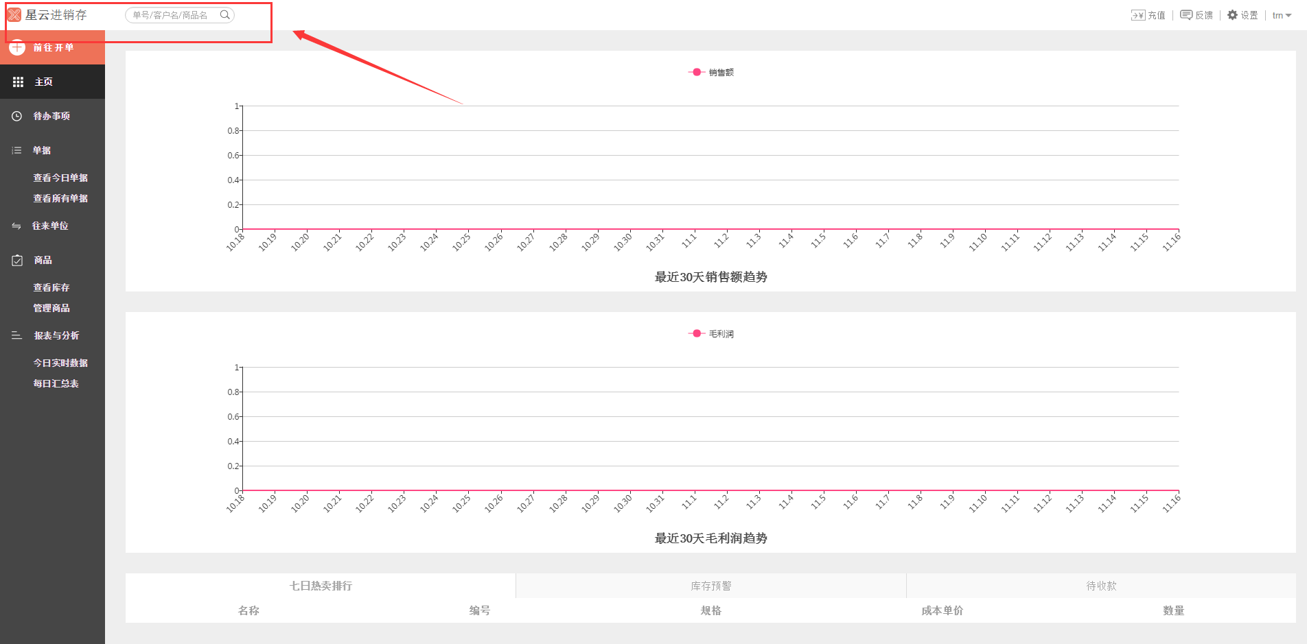 2、页面啊左上角点击logo可以进入官网,搜索框内可按单号、客户名和商品名对整个网站添加的数据进行检索。